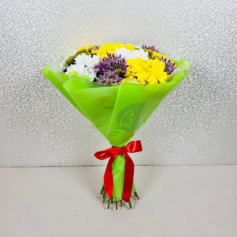 Великолепный букет из 19 веточек кустовой хризантемы. Букет составлен из хризантем разных цветов: сиреневых, зеленых, красных, белых и желтых. Эта красочная, радужная композиция принесёт в ваш дом праздник даже в обычный будний день.