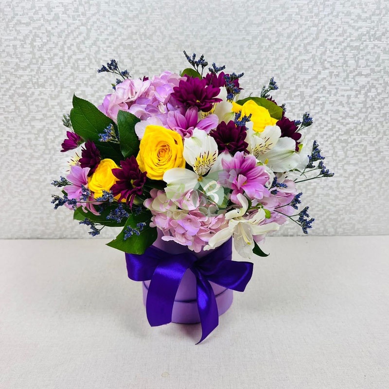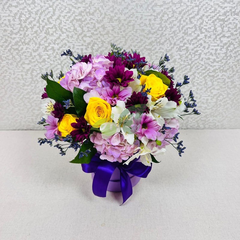 При покупке композиции из фиолетовых цветов в коробке доставка по Семёнову будет бесплатной.